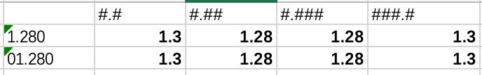 #:数字占位符,一个#代表一位数字,小数点右边多少个#,显示多少位小数,末尾四舍五入,不会显示无意义的0。小数点左边一个或多个#效果一样。