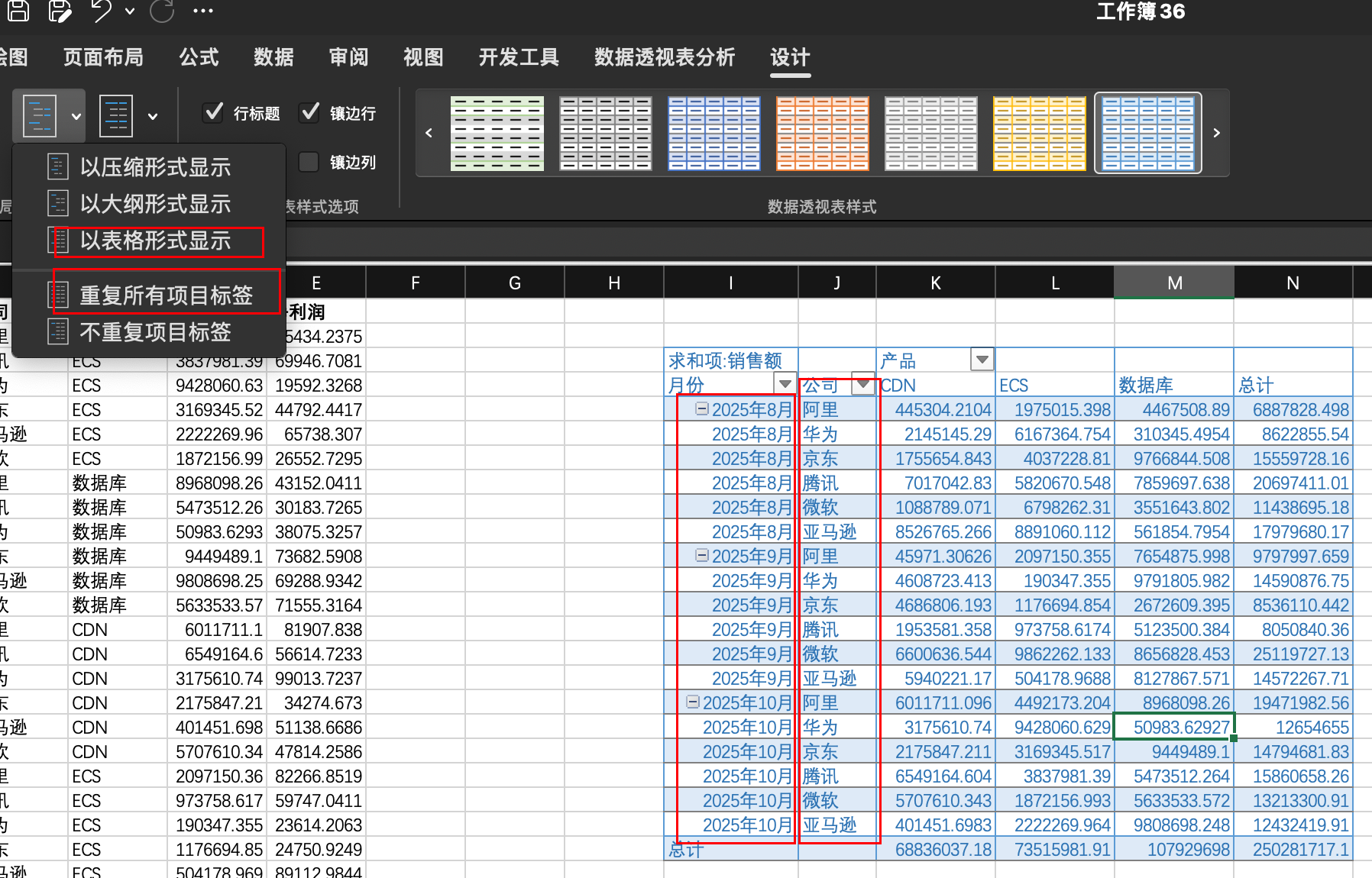 透视表样式:在设计栏目,可以对透视表样式调整,如设置表格颜色,标题,分类汇总,层级展示样等等。比如去掉分类汇总。