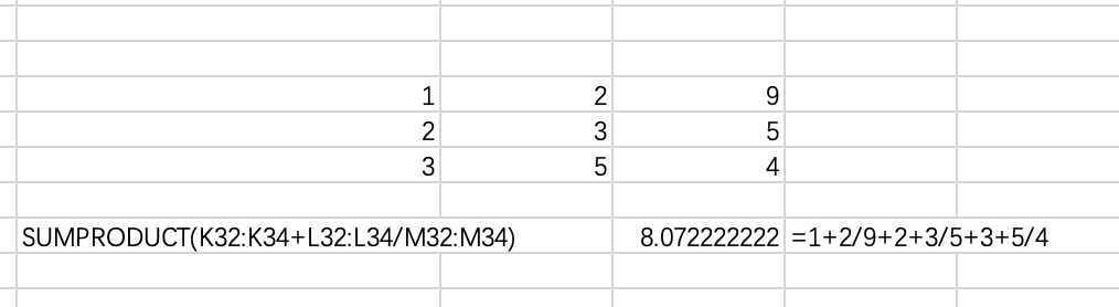 SUMPRODUCT(K32:K34+L32:L34/M32:M34),即1+2/9+2+3/5+3+5/4 ,参数中运算符优先级与普通算术一样。