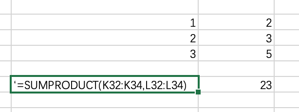 即1*2 + 2*3 + 3*5 = 23 ,SUMPRODUCT默认是求对应位置乘集,也可做对应位置+-*/运算,只需要将参数分隔符逗号替换为运算符号。例如
