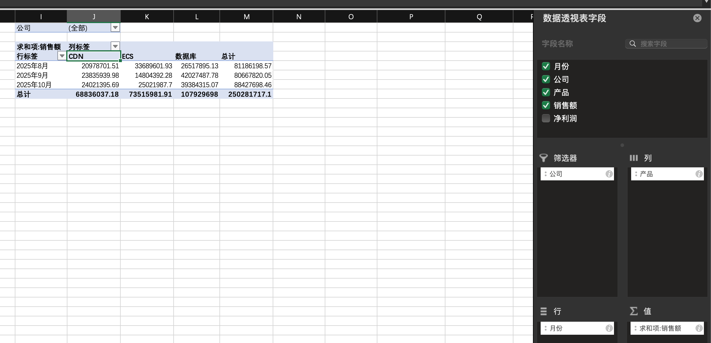 筛选区域可以插入切片器,对透视表筛选,比如查看202508月阿里CDN的销售额。